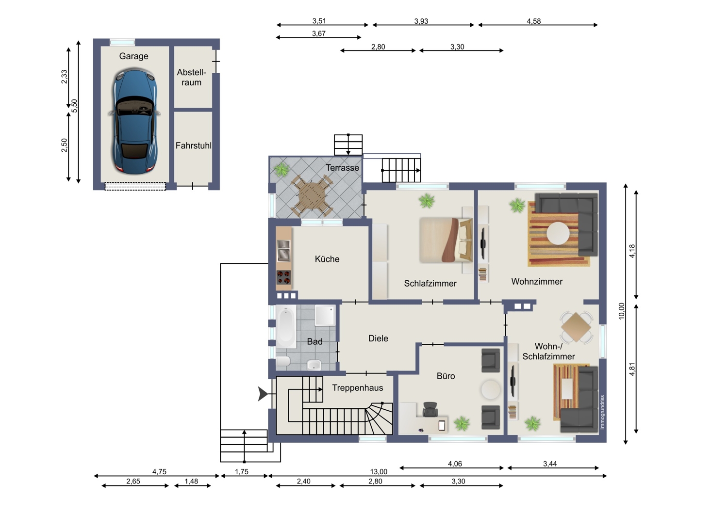 Ein besonderes Entwicklungspotenzial bietet der hintere Grundstücksbereich, der ggf. für eine weitere Bebauung in Frage kommt. Eine entsprechende Bauvoranfrage sollte hierzu gestellt werden.