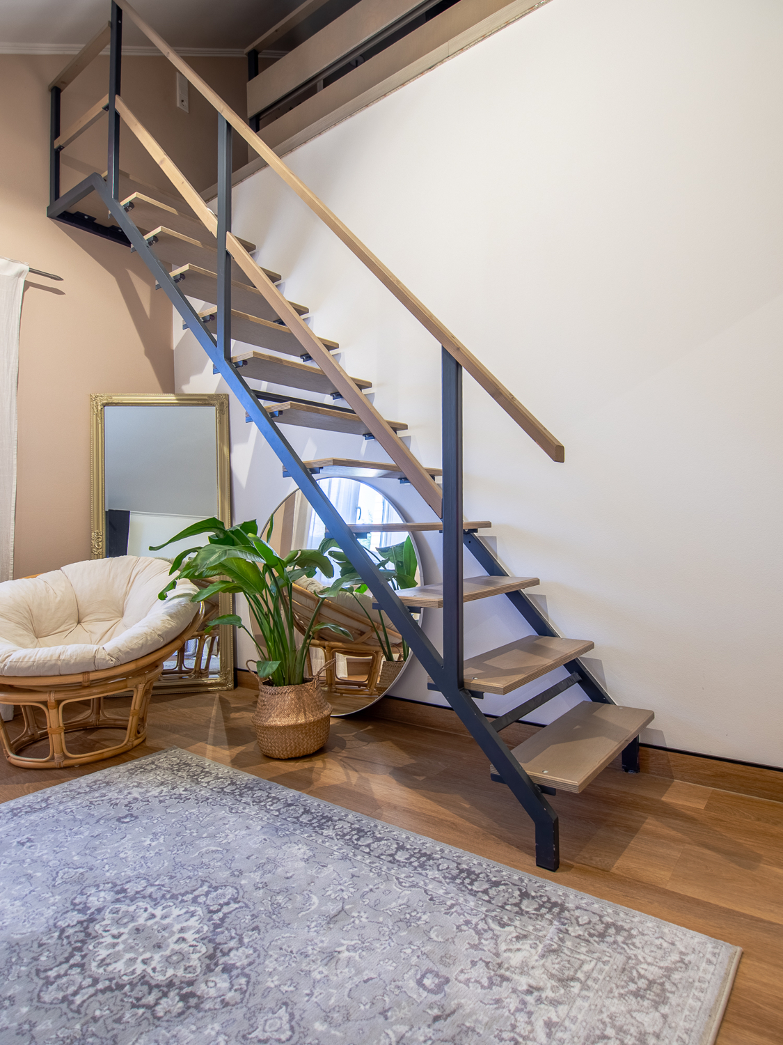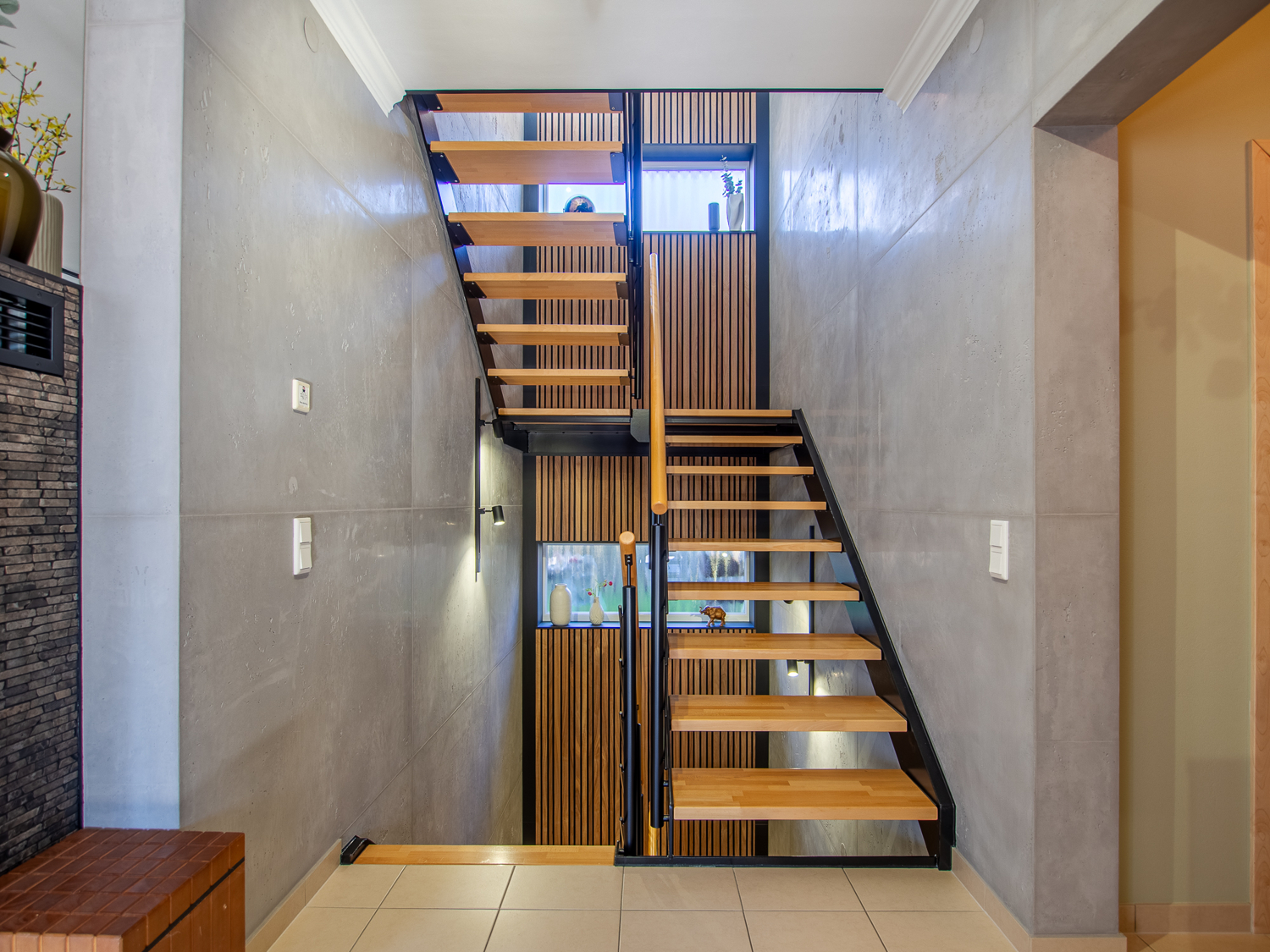 Sichtbare Stahlträger, filigrane Stahlwangen an der Treppe sowie stilvoll eingesetzter Sichtbeton im Wohnbereich setzen architektonische Statements und betonen den modernen, technischen Stil. Hochwertige Holzleisten bilden dazu einen warmen und zugleich eleganten Kontrast.