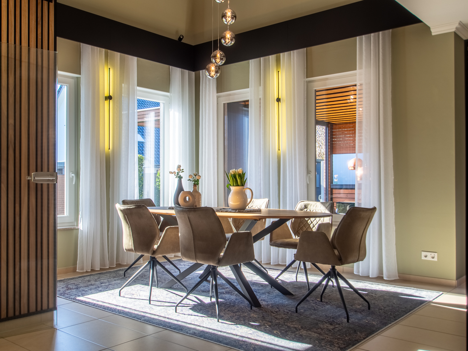 Das Herzstück des Hauses ist der offen gestaltete Wohn- und Essbereich mit fließenden Übergängen. Die erhöhten Decken und großzügigen Fensterflächen schaffen ein besonderes Raumgefühl und lassen viel Tageslicht herein.