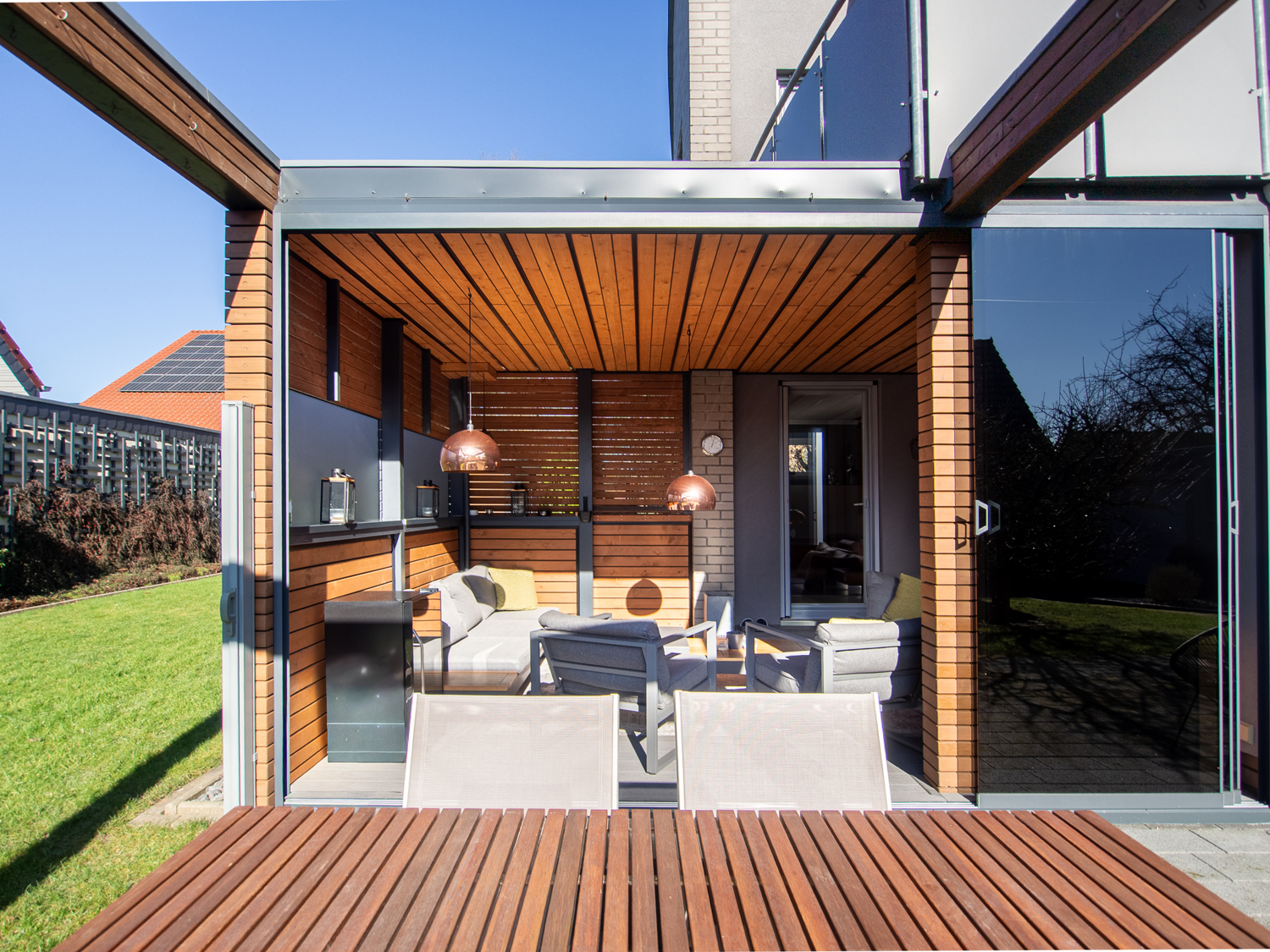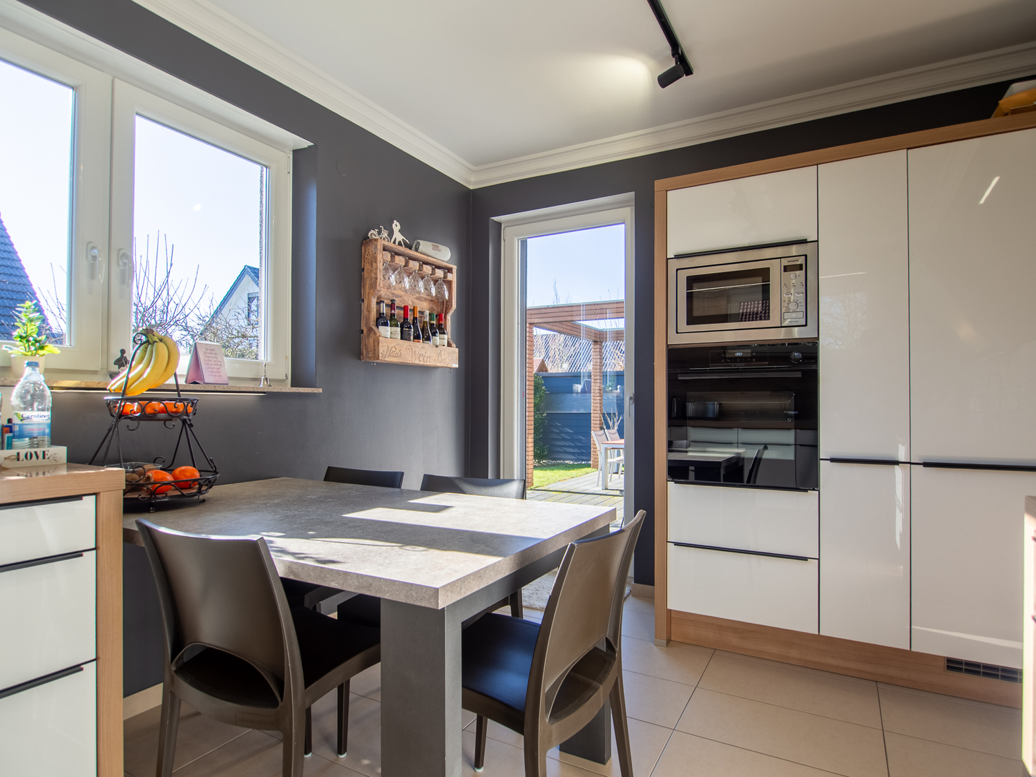 Die moderne Küche überzeugt nicht nur optisch, sondern auch funktional: Mit direktem Zugang zur Terrasse und in den Garten wird sie zum kommunikativen Mittelpunkt – ideal für gesellige Abende und entspanntes Familienleben.