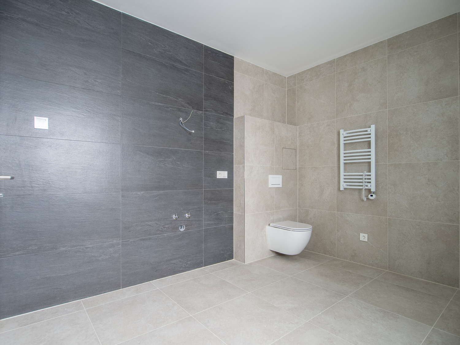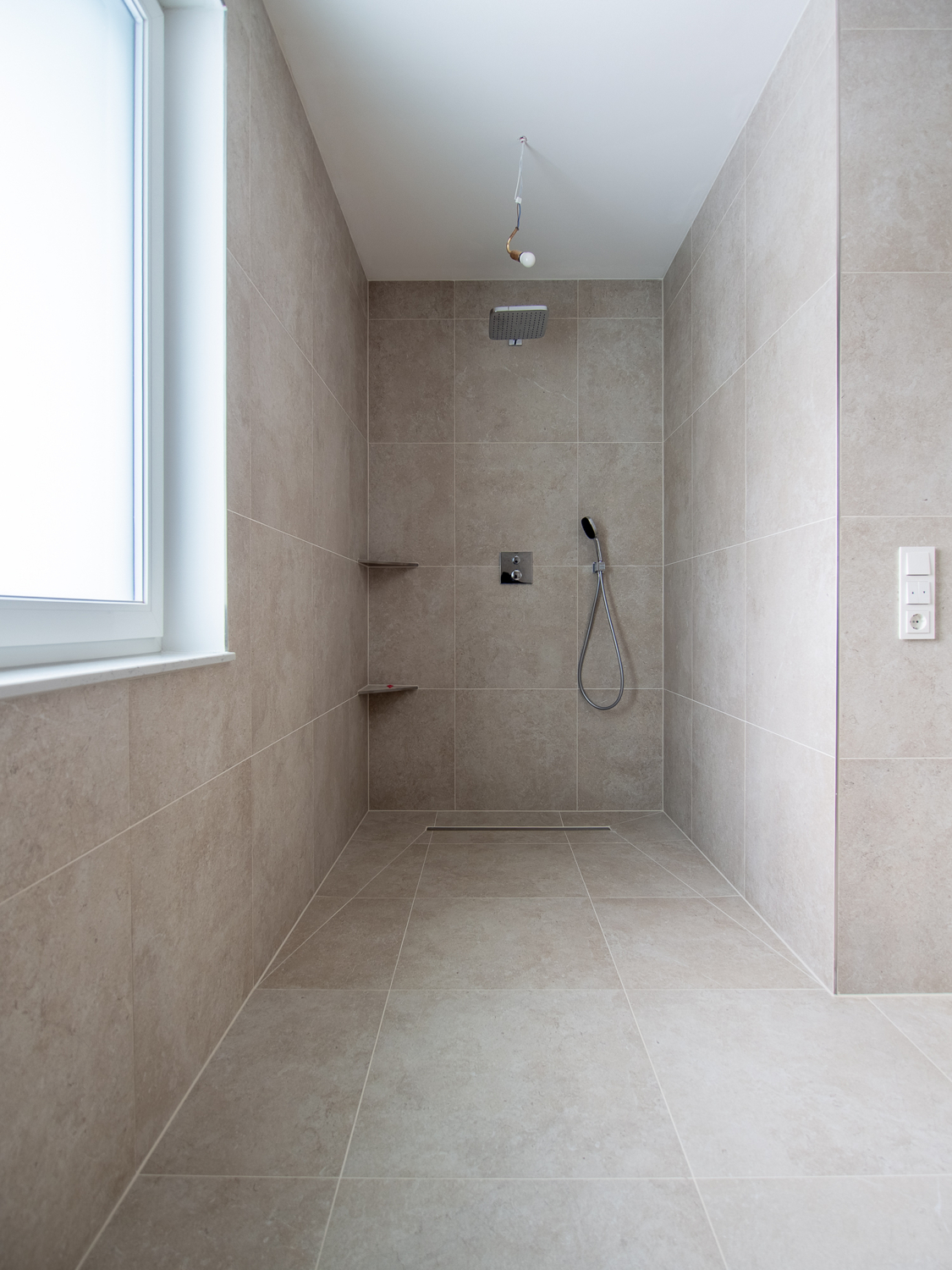 Die Wohnung verfügt über ein modern ausgestattetes Badezimmer mit sehr großer, ebenerdiger Dusche sowie hochwertigen, großformatigen Fliesen, die den eleganten Charakter der Wohnung unterstreichen. Eine Fußbodenheizung in allen Räumen sorgt für angenehme Wärme und ein behagliches Raumklima.